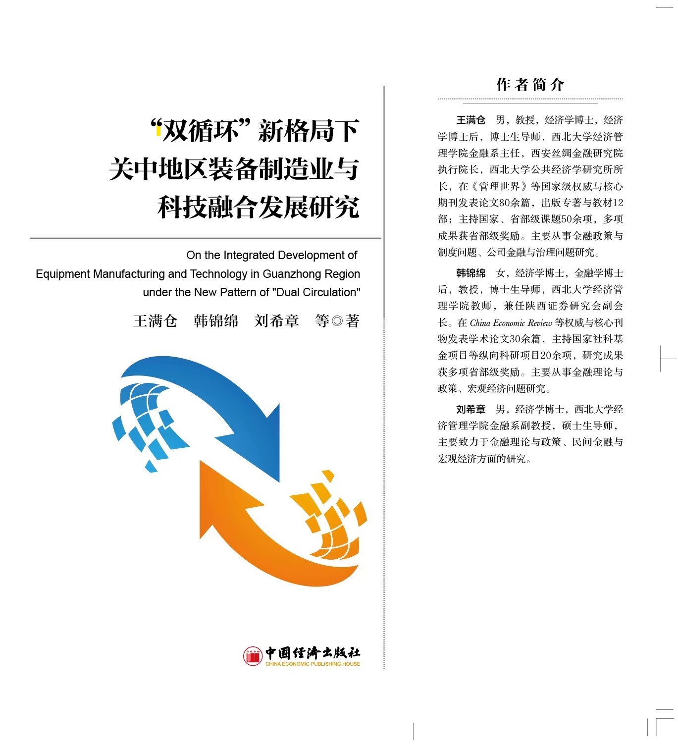 日前,由王满仓教授、韩锦绵教授、刘希章副教授等所著的《“双循环”新格局下关中地区装备制造业与科技融合发展研究》在中国经济出版社出版。该书是王满仓教授所主持的陕西省财政研究院2020年重点项目“打造关中装备制造业与科技融合发展新高地研究”项目的成果之一,该项目在完成过程中形成的建议报告被西安市市委书记、副市长、陕西省财政厅厅长批示,并在陕西省的装备制造企业得以应用。