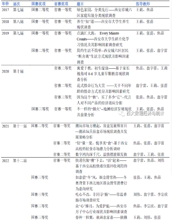 经过师生近5年的持续努力,取得了如下相关成效:①两项赛事已分别入选2022年beat365英国官方网站本科生学科竞赛“推动计划”的A类(高教学会榜单竞赛)和B类项目(学科专业品牌竞赛);②青年教师指导队伍不断壮大,现共有王莉、张苗、焦晶、翁宇雷、李宗欣、刘伟、南士敬和张莉8位老师全程参与公益指导,王莉老师获聘担任全国大学生市场调查与分析大赛评审委员会委员;③参赛人数与获奖项数不断增加,每年动员参赛学生近百人,其中A类的市场调查大赛获得国家一等奖共2项、二等奖3项、三等奖5项;省级一等奖7项、二等奖4项、三等奖1项,促进了学生对社会现实问题的认识分析能力、对真实数据的获取处理能力等方面综合训练;④专业课程建设并行得以推进,与竞赛密切相关的课程《市场调查与分析》于2021年12月获批学校一流本科课程建设线上线下混合设计项目。