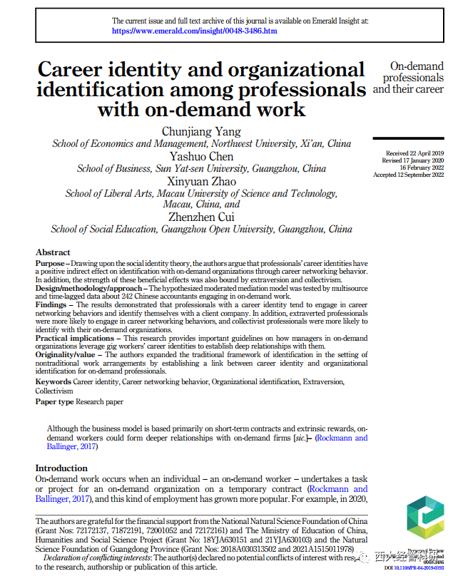 杨春江教授(第一作者)与澳门科技大学的赵新元教授等合作,2022年10月在《Personnel Review》上优先发表了标题为“Career identity and organizational identification among professionals with on-demand work”的学术论文。《Personnel Review》是劳动关系和应用心理学领域的JCR二区期刊(2021年影响因子3.228,近五年影响因子3.899)。该研究以零工经济为背景,探讨了按需工作的专业人员的职业归属与组织归属问题。通过调查242位按需工作的会计人员,发现:专业型“零工”虽然投身于零工经济,但是也会积极的建构职业关系网络,并对主要的服务对象产生认同,从而满足他/她们的职业和归属需要,并且从业者的外倾性人格和集体主义导向在构建职业网络和组织认同中发挥着重要的调节作用。