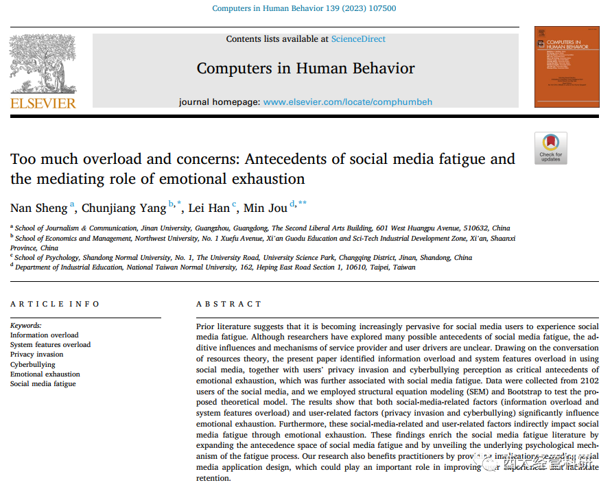 杨春江教授(通讯作者)与暨南大学盛楠教授、国立台湾师范大学的Min Jou教授等合作的论文——“Too much overload and concerns: Antecedents of social media fatigue and the mediating role of emotional exhaustion”,于2022年9月在线发表在跨学科/实验心理学的顶级期刊《Computers in Human Behavior》上 (JCR一区;2021年影响因子8.957,近五年影响因子10.097)。在信息化和网络化的大背景下,该研究关注社交媒体的广泛使用可能给用户造成的负面影响,应用资源保存理论,基于2000多位网络用户的调查数据,实证检验了社交媒体过载(信息过载与系统功能过载)和用户担心(隐私侵犯与网络欺凌)两方面因素对用户的社交媒体倦怠造成的影响,并深入分析了其间情绪耗竭的关键中介作用。