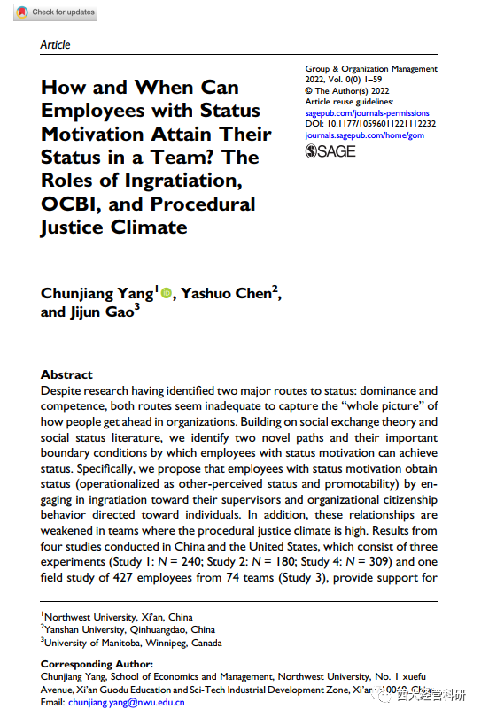 杨春江教授(第一作者和通讯作者)与加拿大曼尼托巴大学的Jijun Gao教授等合作的论文——“How and when can employees with status motivation attain their status in a team? The roles of ingratiation, OCBI, and procedural justice climate”,于2022年7月在线发表在管理学权威期刊《Group & Organization Management》上。该期刊属于应用心理学领域的JCR一区(2021年影响因子4.29,近五年影响因子5.423)。该研究关注“团队成员如何提升在团队中的地位”这一有趣的话题,探讨了能力、逢迎和道德三条路径可能产生的影响。具体的,文章基于社会交换理论和社会地位的现有文献,构建了一个跨层次的多路径模型,通过在中美两国进行的4项研究,实证检验了逢迎行为和OCBI行为对感知地位和晋升可能性的影响,以及其间团队公平氛围的负向调节作用。