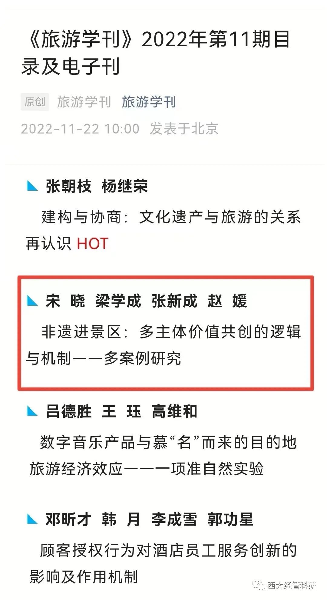 近日,beat365英国官方网站博士生宋晓和导师梁学成教授团队合作论文《非遗进景区:多主体价值共创的逻辑与机制研究——多案例研究》在权威期刊《旅游学刊》2022年第11期发表。非遗进景区是文旅融合的重要表现,也是一个复杂的情境化现象。文章以多案例研究打开了非遗进景区多主体价值共创的过程,识别了多主体价值共创的逻辑与机制。研究发现:非遗进景区是由目的地政府、景区管理方、非遗传承人和游客构成的服务生态系统,各主体参与价值共创的驱动因素-行为过程-价值表现的逻辑不同,非遗进景区价值共创呈现出多主体耦合性、非线性网络性、非对称性和公共价值性的特征;四方行为主体分别作为环境塑造者、价值编排者、文化输出者和文化体验者,在多主体价值共创中发挥独特的作用;非遗进景区多主体价值共创机制表现为在主体间的多重互动、服务交换和资源整合中,价值共创程度取决于场景体验性和产品创新性两个因素,以高场景体验性和高产品创新性达到共振型价值共创才能最终实现主体价值和公共价值。研究把非遗和旅游的协同作用与价值共创联系起来,为理解非遗进景区积极作用的发挥提供了新的视角;关注非遗价值转化为旅游价值的过程,为非遗旅游化开发提供理论依据,为推动非遗进景区及非遗旅游产品开发提供借鉴。