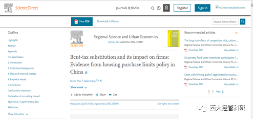 其中,赵仁杰副教授作为第一作者发表在Regional Science and Urban Economics的论文“Rent-tax substitution and its impact on firms: Evidence from housing purchase limits policy in China”主要利用中国的房地产限购政策,研究了限购带来的财政压力对企业税负以及生产经营行为产生的多维度影响,揭示了租税替代现象并为其提供了基于中国的经验证据,丰富了关于重负收入结构调整影响企业行为的相关文献。