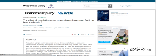 赵仁杰副教授作为通讯作者发表在Economic Inquiry上的论文“The effect of population aging on pension enforcement: Do firms bear the burden?”采用城市与企业层面的匹配数据,研究了中国地区人口老龄化问题对企业社保缴费负担及其生产经营行为的影响,发现人口老龄化增加了企业的养老金缴款,而财政压力是人口老龄化影响养老金执行的渠道,养老金管理制度可能会影响人口老龄化的净影响。