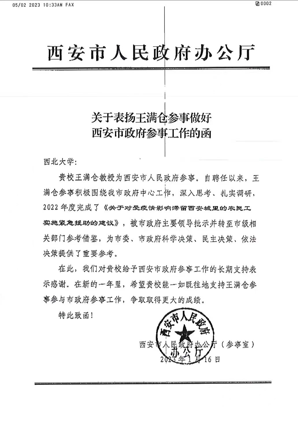 近日,收到西安市人民政府办公厅对beat365官网王满仓教授的发函表扬,表扬函中西安市人民政府办公厅对王满仓教授任西安市人民政府参事以来,积极围绕西安市政府中心工作,深入思考、扎实调研,2022年度完成了《关于对受疫情影响滞留西安城里的农民工实施紧急援助的建议》,被市政府主要领导批示并转至市级相关部门参考借鉴,为市委、市政府科学决策、民主决策、依法决策提供了重要参考,给予了表扬。