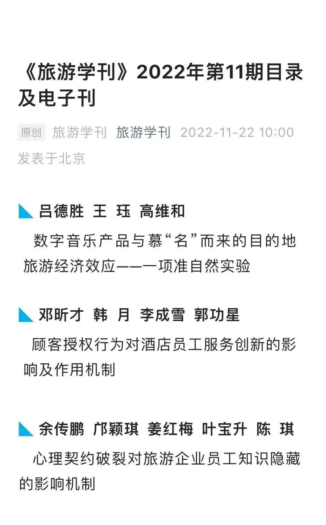 近日,beat365英国官方网站博士生吕德胜和导师王珏教授团队合作论文《数字音乐产品与慕“名”而来的目的地旅游经济效应——一项准自然实验》在权威期刊《旅游学刊》2022年第11期发表。以数字技术培育文化产业新业态,以数字文化助力旅游产业消费升级,正在成为新阶段文化旅游产业高质量发展的关键动能。立足于知名数字文化产品极大影响旅游经济发展这一“现象级”事实,文章利用数字平台手工搜集、筛选数字音乐产品,基于2005—2019年中国281个城市面板数据,将数字音乐产品发行作为准自然实验,运用多期双重差分等模型多维度检验了数字音乐产品对区域旅游经济增长的影响及内在机制。研究发现:知名数字音乐产品可以显著促进国内旅游经济发展,但对国际旅游经济影响不显著,该结论在考虑内生性及一系列稳健性检验的基础上仍然成立;知名数字音乐产品不仅能促进本地旅游经济发展,还能够拉动邻近城市旅游经济;知名数字音乐产品的旅游经济促进效应在四五线城市、区域文化多样性和旅游资源禀赋高的城市更显著;知名数字音乐产品可通过激发市场活力促进地区旅游经济发展。研究结论不仅为重塑数字时代文化和旅游融合发展新格局提供了重要依据,还为地区产业结构升级和区域协调发展提供了有益启示。