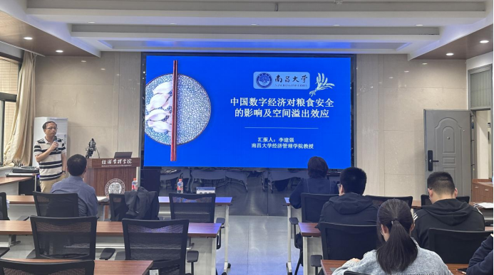 李建强教授在正式开始讲座之前,先向大家详细介绍了与数字经济、能源经济相关的各大期刊审稿要点、投稿时间等,并强调了学术规范的重要性。接着,李教授从题目的确定、文献综述、理论分析、研究设计、结果分析、结论与对策建议六个部分展开讲述。首先,李教授认为,从中长期来看,我国粮食安全与生态安全呈现出脆弱性的特征,因此,探讨数字经济对粮食安全的影响具有现实意义;其次,着重强调了实证分析部分解释内生性问题的重要性;最后,阐述了该研究得出的结论:从空间相关性方面来看,数字经济水平的提高能够显著提升中国的粮食安全水平;从空间溢出效应来看,数字经济发展总体上能够有效促进粮食安全水平提升,但是数字经济对本地区的粮食安全具有抑制作用,而对周边地区的粮食安全具有促进作用。讲座的最后,在座学生和老师针对李建强教授的讲座内容积极提问,李教授一一做了回答。岳利萍教授对李教授的精彩分享做了总结和点评。李建强教授简介:李建强,南昌大学教授、博士生导师。现任国际工程技术协会(IETI) 会士、江西省“双干计划” 创新领军人才。先后担任EnergyEconomics、AppliedEconomics、EconomicAnalysisandPolicy、EmergingMarketsFinanceandTrade等11家国际权威期刊的领域主编、客座主编。主要研究方向为能源经济、绿色金融、低碳经济。在国际权威期刊上发表SSCl、SCl论文200多篇,发表论文H指数71,ESI高被引论文(前1%)40篇、ESI热点论文(前0.1%)21篇,具有丰富的外文论文撰写和评审经验;主持国家社会科学基金重点项目:入选“2022年全球前2%顶尖科学家”“2022全球学者学术影响力排行榜”;荣获“马奎斯世界名人录终身成就奖”“中国高被引学者”“亚洲前1%经济学者”等奖项。