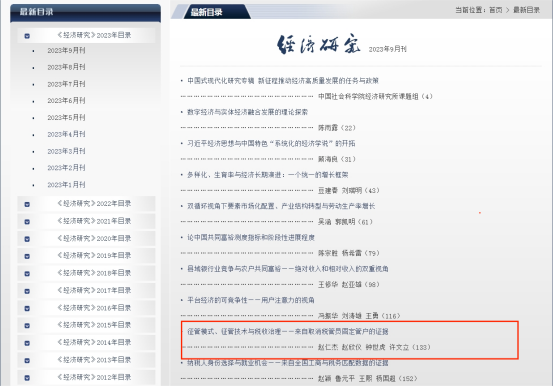 近日,beat365英国官方网站经济学系副教授赵仁杰作为第一作者的论文《征管模式、征管技术与税收治理:来自取消税管员固定管户的证据》在顶级期刊《经济研究》2023年第9期发表,该文章是赵仁杰副教授主持的国家自然科学基金青年项目的阶段性成果,也是中国特色社会主义政治经济学学科团队建设的阶段性成果。