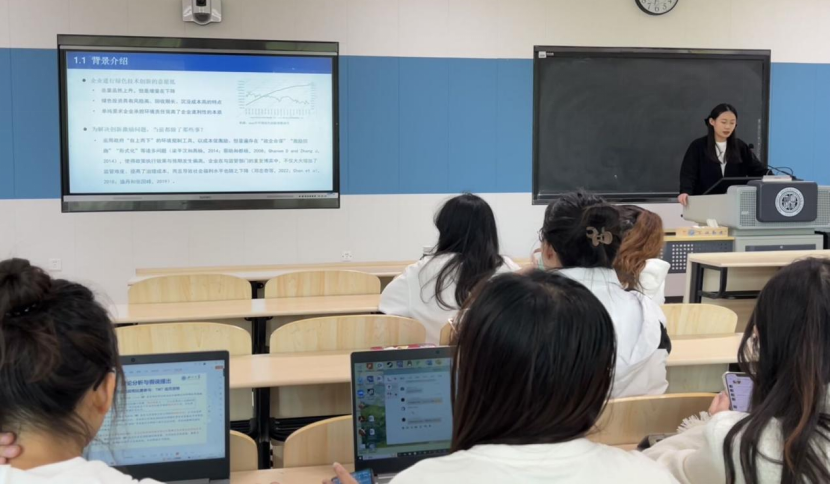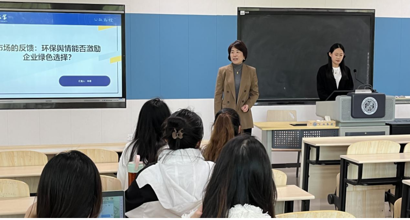 在报告环节,辛萌同学从环保舆情角度研究企业绿色选择,重点从理论分析与机制假说、模型设定、实证结果等方面对文章进行汇报,通过使用2011—2022年中国A股上市公司的数据,实证检验了环保舆情的绿色技术激励效应。在点评环节,葛鹏飞老师首先充分肯定了论文的研究意义,并向同学们阐述环保舆情的准确概念。其次,葛鹏飞老师根据论文提出了细致的修改意见,建议辛萌同学在后续写作过程中要突出关键词和创新点。最后,葛鹏飞老师还补充了一些更为细致的修改建议,比如补充理论出处及文献信息等。南士敬老师针则对数据、模型设定、交互作用的系数解释、工具变量法的表述、稳健性检验、格式和排版等方面提出具体的修改建议,并重点强调了论文前后的统一性和数据来源的明确性。