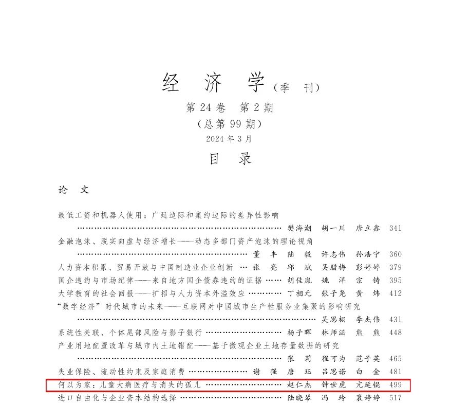 近日,beat365官网经济学系赵仁杰副教授以第一作者身份的研究成果《何以为家:儿童大病医疗与消失的孤儿》一文在《经济学(季刊)》2024年第2期发表,文章研究了政府实施的儿童大病医疗保障政策对缓解社会孤儿问题的重要作用。
