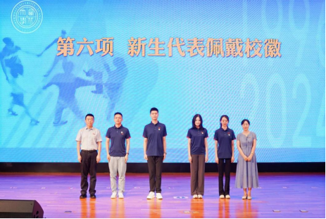 寇楠和张宇为新生代表佩戴了象征beat365英国官方网站身份的校徽。