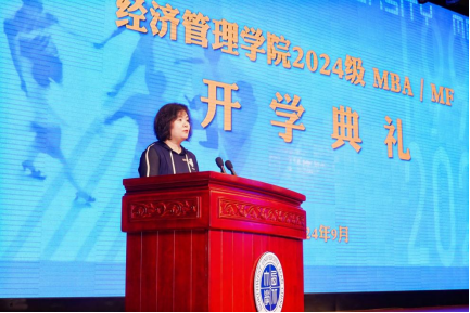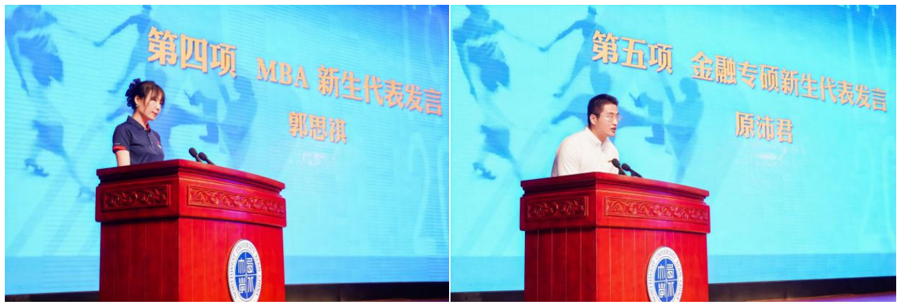 2024级郭思祺和原沛君同学分别代表MBA和金融专硕新生发言。两位同学表达了对即将开始的研究生时光的憧憬,表示要将个人成长和国家发展、民族复兴相结合,努力学习,不负时光。
