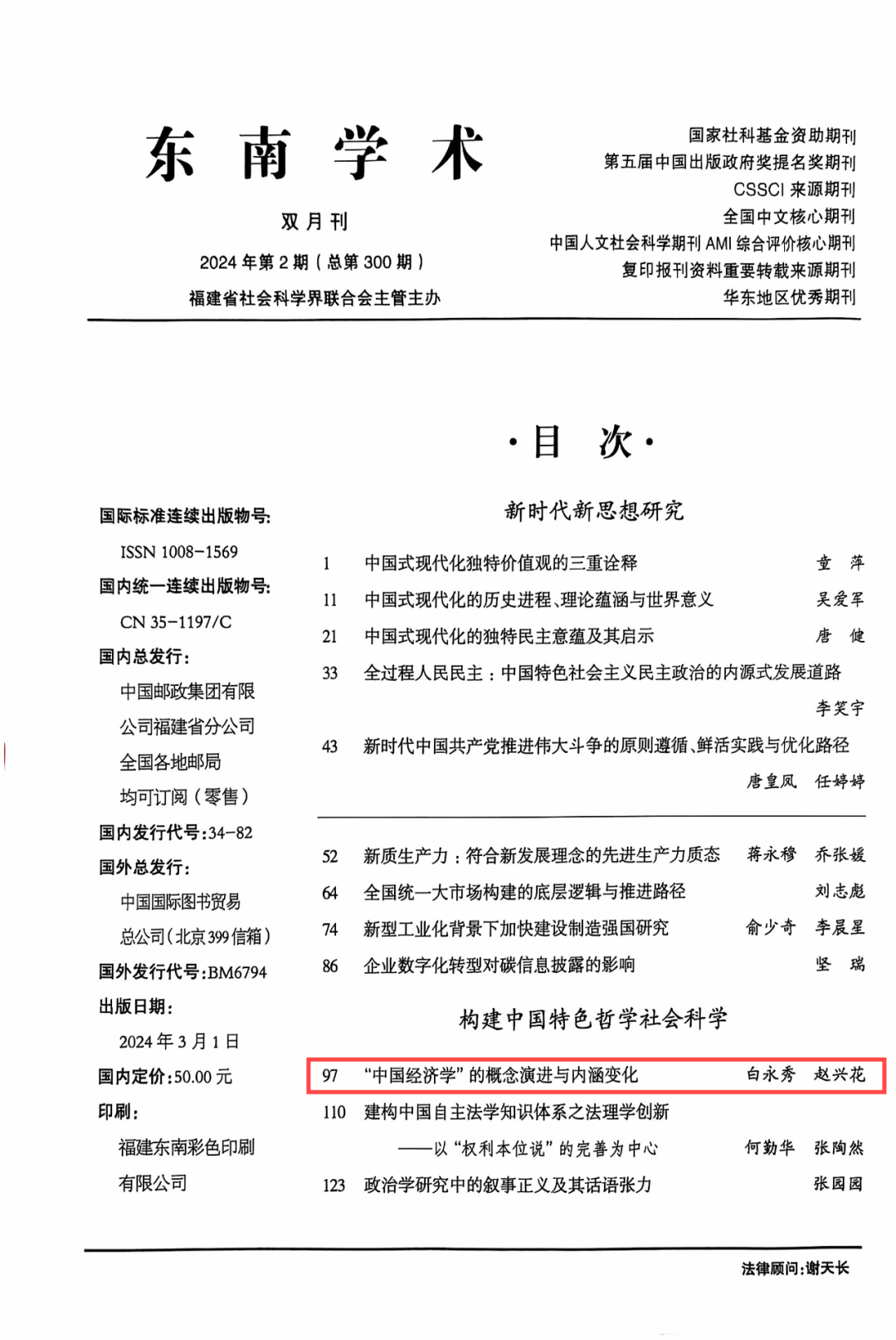 beat365官网博士生导师白永秀教授与博士生赵兴花合作发表的论文《“中国经济学”的概念演进与内涵变化》(原载于《东南学术》2024年第2期)被《新华文摘》2024年第18期全文转载。