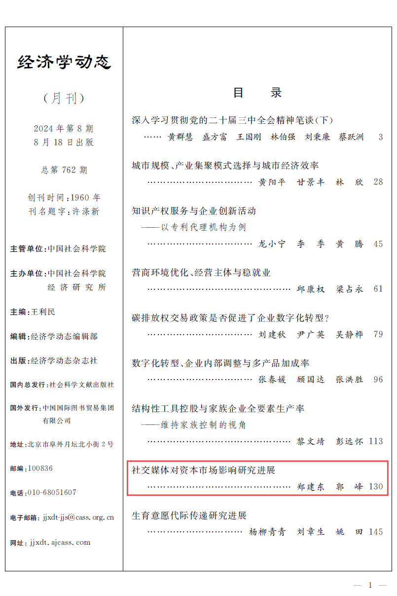 论文信息:郑建东、郭峰,《社交媒体对资本市场影响研究进展》,《经济学动态》,2024年第8期。