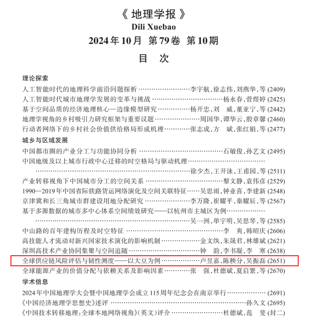 近日,beat365官网博士后卢昱嘉和吴振磊教授的研究成果《全球供应链风险评估与韧性测度——以大豆为例》一文在《地理学报》2024年第10期发表,文章以大豆作为典型研究对象,深入分析了全球供应链的潜在风险与韧性水平。当今世界正处于百年未有之大变局,供应链韧性与安全成为各方重点关切。以大豆为代表的进口依赖型农产品供给更加取决于全球供应链系统和贸易网络运行状态,实现保供稳供面临较高的不确定性。面对有增无减的国际资源和市场利用风险,跨境供应链治理成为耦合重要农产品供求的关键因素。文章构建涵盖供应、采购、运输、需求等四个阶段和出口商、物流与运输部门、进口商等三个环节的供应链分析框架,定量评估了大豆全球供应链的风险与韧性水平。研究发现,近年来,大豆进口供应链整体风险不断上升,风险主要来自需求和采购阶段,与出口国的贸易关系、经济政策不确定性是影响大豆进口供应链安全的长期风险因子。中国自巴西进口大豆供应链的整体韧性相比美国和阿根廷较强,显示了与巴西探索优化供应链协作的充分潜力。本文不仅可为更好地利用国际资源与市场、保障农产品进口安全提供科学依据,也可发展典型产品跨越地理空间的风险韧性治理理论与方法,拓展资源地理研究。