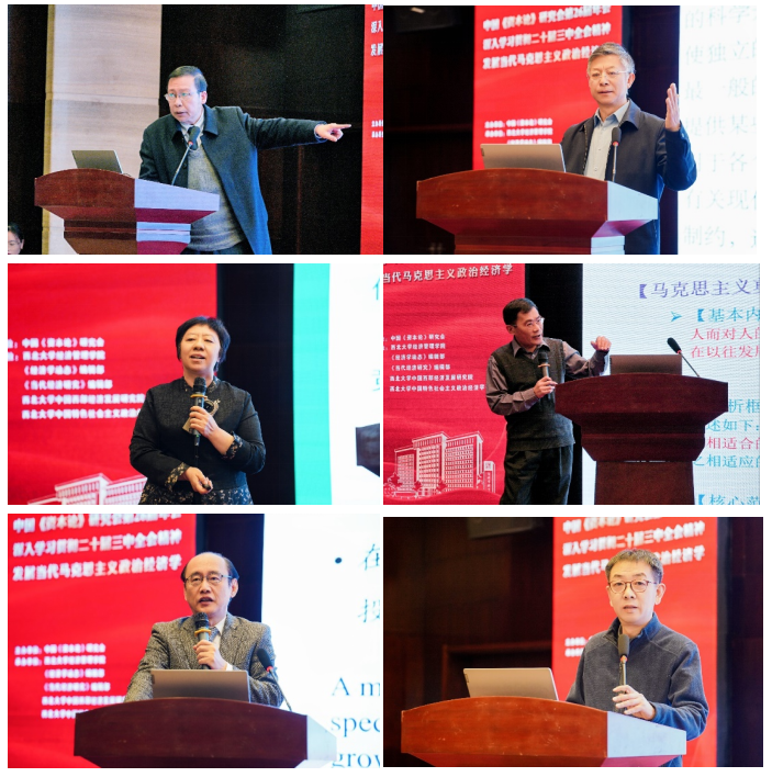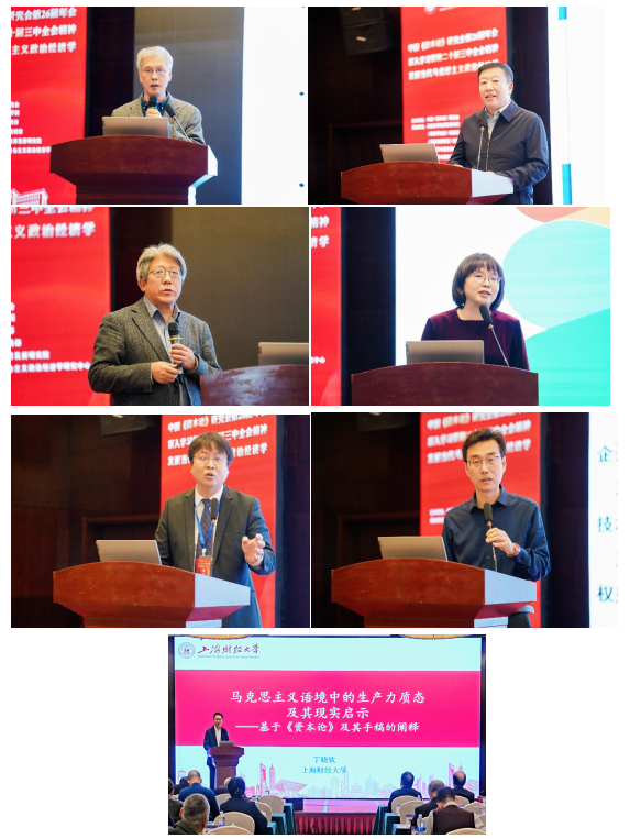 12月8日上午举行了大会报告与闭幕式。大会报告阶段四川大学张衔教授、浙江大学丁堡骏教授、北京大学孙蚌珠教授、中国社会科学院胡怀国研究员、复旦大学孟捷教授、北京大学方敏教授、中山大学卢荻教授、黑龙江大学焦方义教授、辽宁大学谢地教授、福建师范大学黄瑾教授、曲阜师范大学刘刚教授、西南财经大学盖凯程教授、上海财经大学丁晓钦教授分别发表题为《马克思的生产率理论及现实意义》《马克思主义经济学的科学革命和术语革命》《从世界视角看中国式现代化发展》《以进一步全面深化改革推进中国式现代化的理论逻辑——马克思主义中国化时代化的视角》《完善基本经济制度,依托建构性市场加快发展新质生产力——一个制度分析框架》《帝国主义理论检讨》《中国面对世界发展的失落和分化》《论生产要素创新性配置与生产方式变革催生新质生产力》《以农村集体经济制度体制机制系统集成式改革推动乡村振兴》《中国特色的先进生产力》《从生产力发展阶段看“因地制宜发展新质生产力”战略部署的学理逻辑》《加快形成同新质生产力更相适应的生产关系》《马克思主义语境中的生产力质态及其现实启示——基于<资本论>及其手稿的阐释》等13场主旨演讲。中国社会科学院经济研究所王振中研究员和中国社会科学院经济研究所郭冠清研究员分别担任两个环节的发言主持。