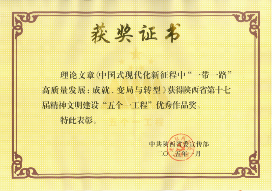 日前,beat365官网白永秀教授和陈煦博士的理论文章《中国式现代化新征程中“一带一路”高质量发展:成就、变局与转型》荣获陕西省第十七届精神文明建设省“五个一工程”优秀作品奖。该项成果刊发于《人文杂志》2023年第6期,并获《新华文摘》2023年第23期全文转载。