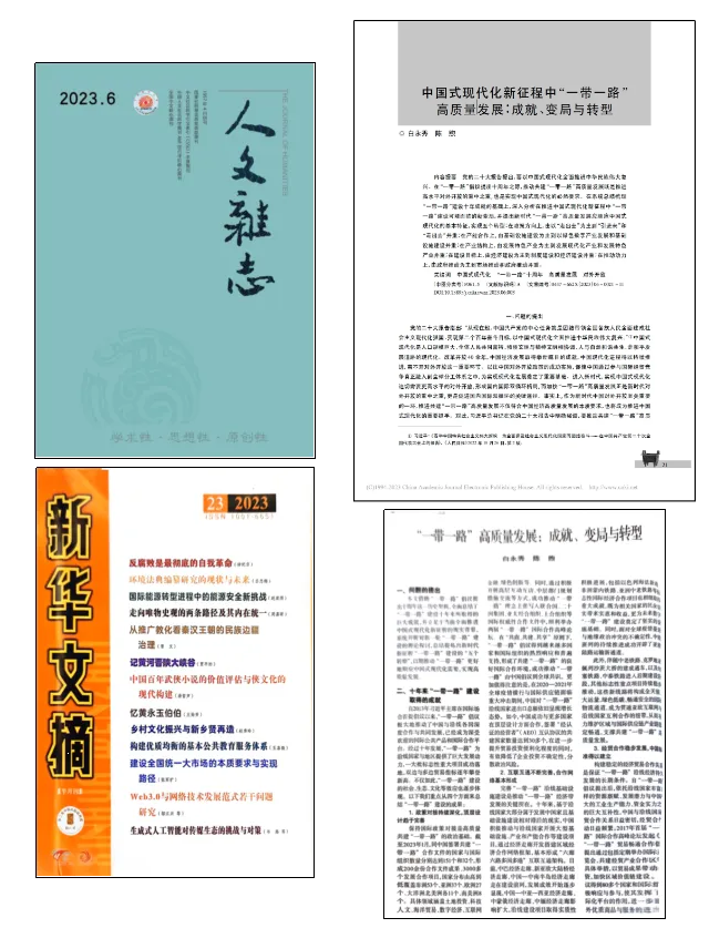 自2013年“一带一路”倡议提出以来,白永秀教授带领研究团队积极响应国家战略,围绕该领域的重大理论与现实问题深入开展研究,发表相关学术论文50余篇,被《新华文摘》《中国社会科学文文摘》《高等学校文科学术文摘》《中国人民大学复印报刊资料》等转载10次(其中《新华文摘》全文转载2次),承担中省各类科研项目9项,出版著作4部,荣获奖励11项,形成较为广泛的学术与社会影响力。立足于“一带一路”建设伟大实践,白永秀教授领衔的研究团队将继续加强学术研究,推动构建“一带一路”建设的学术框架和话语体系。