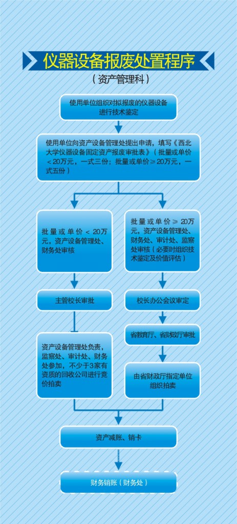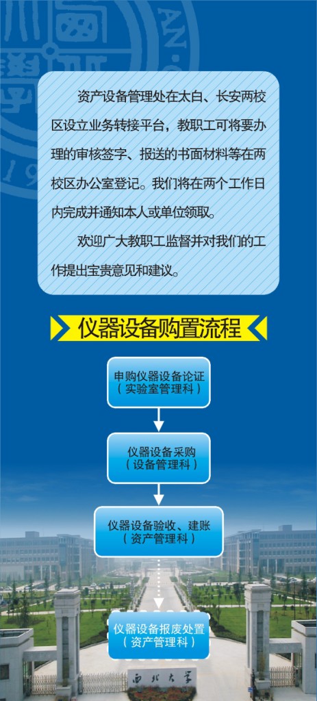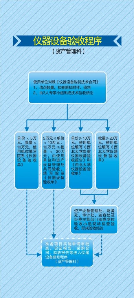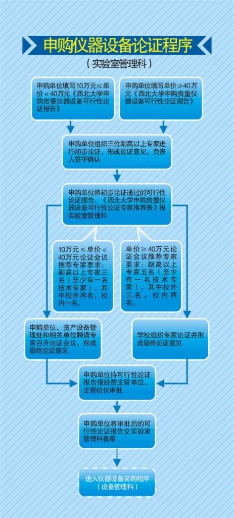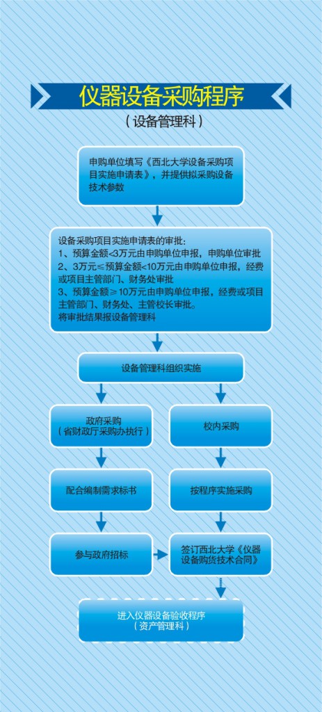 学校于2012年6月12日召开了全校仪器设备管理与实验室建设工作会议,对全校各单位的仪器设备购置和管理作了新的规定,在工作流程上也进一步进行了规范。会议要求,学院公共经费和教师个人经费用于购买仪器设备时,都要严格按学校仪器设备购置流程进行办理。为方便老师们了解和办理相关业务,现将学校资产设备管理处制定的仪器设备采购和管理工作流程予以公布。