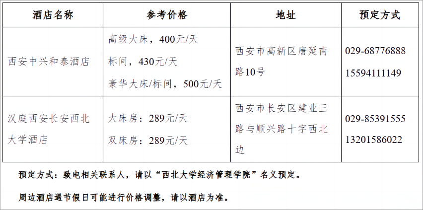 八、住宿酒店预订信息:参会者请于2024年10月10日前将参会回执发送到邮箱rsachy@163.com(请注明“2024西安年会回执”),会务组将根据回执及时通知后续事宜。参会者请务必根据下列预订方式,自行完成酒店预订。