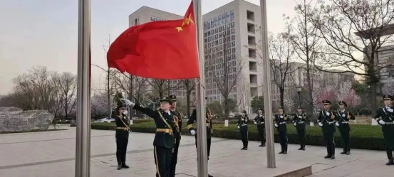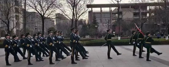 《义勇军进行曲》响彻在北广场上空,全体成员整齐地列队,凝视着鲜艳的五星红旗冉冉升起,向着国旗敬礼,齐唱国歌。
