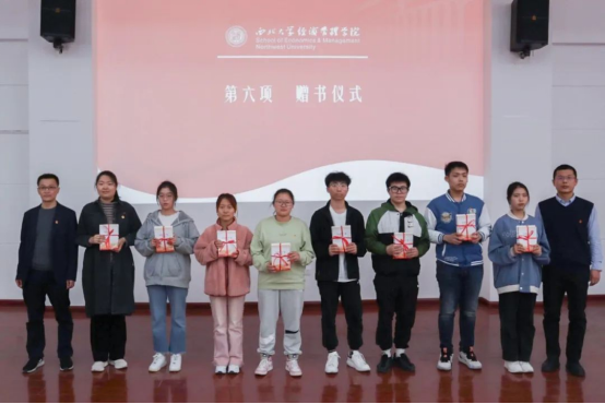 在赠书仪式环节,由校团委副书记齐钊、院党委副书记徐自成为学员代表赠送书籍。