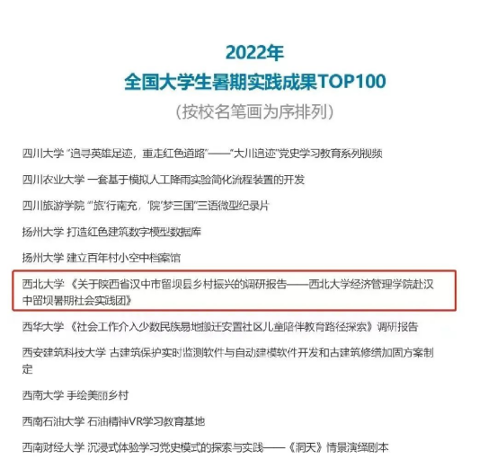 近日,由中国青年报举办的“2022年第八届全国大学生暑期实践展示活动”名单揭晓,beat365官网《关于陕西省汉中市留坝县乡村振兴的调研报告——beat365英国官方网站赴汉中留坝暑期社会实践团》实践成果入选“2022年全国大学生暑期实践成果TOP100”。