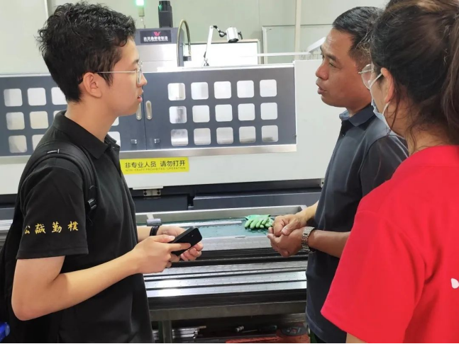 紧接着我们前往同样位于工业园区的达沃鑫智能制造有限公司,在这里我们了解到商南工业核心零部件制造业的发展。随着团队一步步深入制造区域,一个成熟的制造产业链展现在我们眼前。根据企业负责人介绍,该企业主要生产光伏、军用设备零部件,强调精准定制,遵循国际化标准,生产品质可以比肩台湾、日本的产品。该企业的落户同样得益于商南政府对中小企业在房租、税费及员工住宿配套设施等多方面的优惠政策,才将企业从东莞吸引到商南落户,实现了地方与企业的双赢。