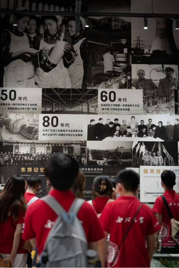 东郊记忆座落于四川省成都市成华区,是以“时尚设计与音乐艺术双柱求发展”为定位的国际时尚产业园区,被称为“中国的伦敦西区”,是成都国家级文化和科技融合示范基地。它的前身为东郊老工业区的原国营红光电子管厂,在原厂旧址的基础上,将部分工业特色鲜明的厂区作为工业文明遗址予以保留,并与文化创意产业结合,打造成音乐产业基地。园区工作人员向团队成员介绍了东郊记忆的历史及发展规划,并带领团队共同参观了工业文化广场、东郊记忆馆、成都舞台、火车头广场、歼教5型飞机等典型景点。