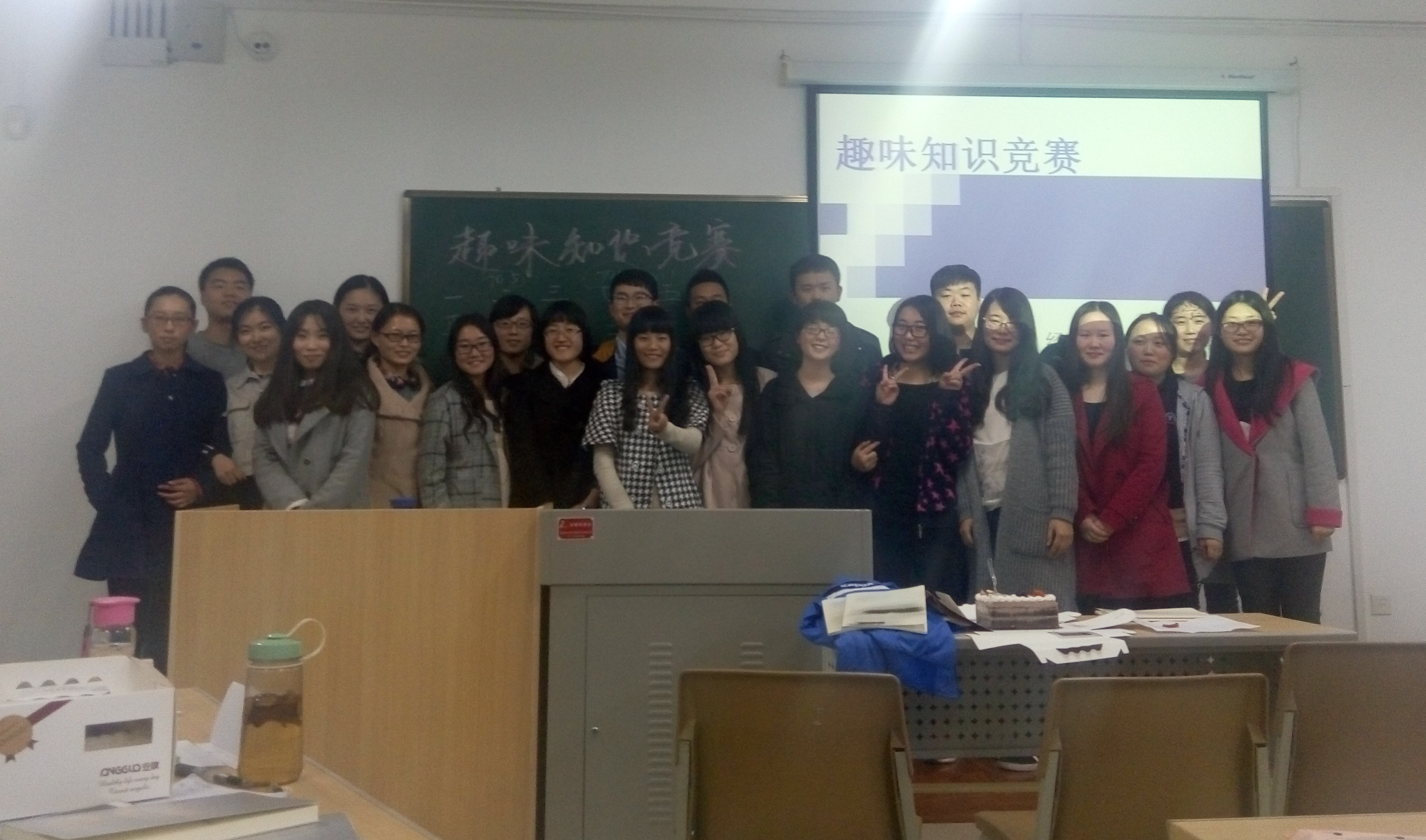 本次比赛参赛人员为2015级研究生组成的5支队伍。比赛分两个部分,分别是知识竞赛和“我爱记歌名”。知识竞赛为常规问答,分为必答题和抢答题,各小组积极抢答,比赛现场热闹非凡。“我爱记歌名”为抢答题,流行金曲,经典老歌,红歌和儿歌都被大家一一猜中歌名,活动气氛到达高潮,第二小组上台献唱并且得到加分,最后还增加了附加风险题以拉开各小组分数差距。答题结束,以比赛得分加总排名。最后,由主持人为获奖小组颁奖,一、二、三等奖分别获得保温杯、笔记本和防雾霾口罩等奖品,同时各参赛小组均获得蛋糕一个。