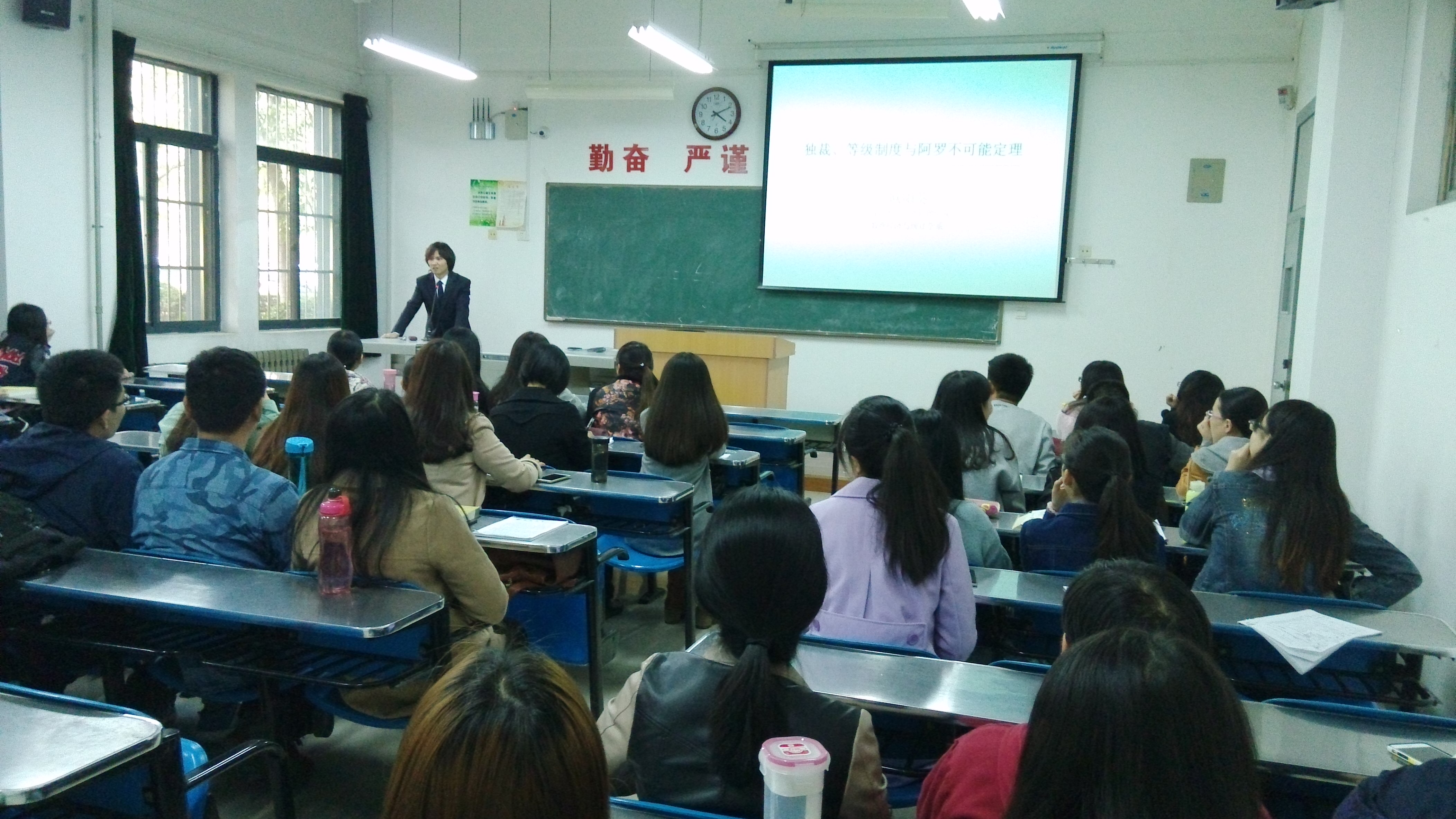 报告中,欧阳葵副教授首先介绍了自己本科和研究生阶段在华南理工大学的学习情况,并结合自己任教和发表论文的经历,告诉学生数学基础对于研究经济学很重要。他认为,研究经济学需要很强的计算能力和逻辑思维能力,并且要有耐心,要坚持到底才能有所收获。接下来,他为学生讲解了一些他对独裁、等级制度以及社会选择理论的研究,并且着重介绍了他对阿罗不可能定理的另一种证明方法,在讲解中,欧阳葵副教授还大量加入自身经历和一些社会实例,使同学们受益匪浅。