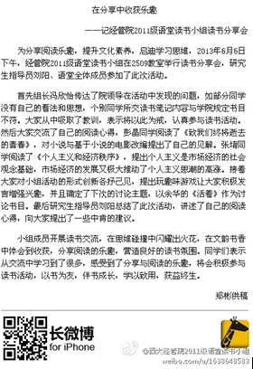 图四:“语堂”读书小组积极将自己的读书心得与体会以长微博的方式与全体同学共享