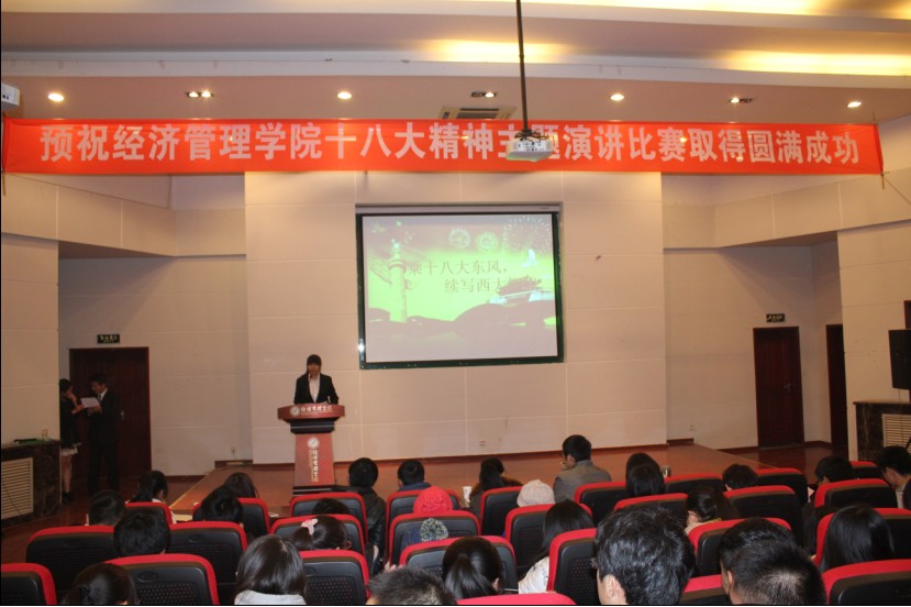 为积极引导广大同学全面准确领会党的十八大精神,在全院学生中兴起学习宣传贯彻十八大精神的热潮。12月12日晚,经管学院在金海恒业报告厅举办了“坚定信念,立志成才”弘扬十八大精神为主题演讲比赛,全院200余名同学观看了比赛。