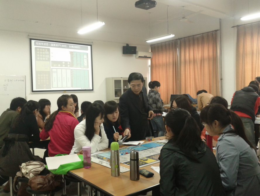 大赛的开始是由各参赛小组组长分别上台介绍自己的团队。紧接着,吕老师为参赛成员做了沙盘模拟大赛的简单介绍。他主要从实战演练的目的、实战演练的准备工作、企业目前的状态以及实战演练的规则等几个方面进行了阐述。吕老师认为企业沙盘模拟大赛具有体验式培训的特点,能够让学生迅速感受企业经营的过程,是一件非常有意义的赛事。他在讲述的同时,指导参赛队员填写沙盘模拟大赛手册上的资产负债表,并让各小组的CEO做好企业初始状态的准备工作。之后,吕老师又带领各参赛队伍进行了初始年份的演练。通过演练,各参赛队员便迅速进入角色和状态。整个比赛现场气氛活跃,团队内部互相配合,团队之间激烈竞争。三年模拟经营结束后,大赛以参赛队伍的净资产高低作为排名标准,最终“ONLY组合”获胜。比赛结束后,吕老师对各参赛队伍的表现进行了点评和总结,并对同学们提出了一些建议,也寄予了厚望。活动收到了良好的效果。