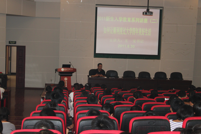王宝书记首先对同学们到经管学院学习表示热烈的欢迎,对同学们和家长选择经管学院表示衷心的感谢。接下来王书记结合学院教授们的成功经历,教育同学们要树立远大的理想,追求上进,用先进的思想武装自己的头脑,把个人的成长发展和时代的要求紧密结合起来,为祖国的繁荣和民族的振兴做出贡献。其次,要热爱所学专业,端正学习态度,珍惜时间,刻苦学习,做到如饥似渴、废寝忘食、永不满足,为将来走向社会,服务人民打下坚实的基础。第三要模范遵守校规校纪,严以律己,尊重同学,关心同学,同学之间和睦相处,共同进步,热爱集体,积极参加集体活动,始终保持乐观向上的阳关心里,愉快度过大学美好的时光,做一名对祖国、对人民有贡献的合格大学生。