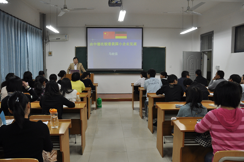 10月22日晚,beat365官网马晓强副教授应邀在8213教室作了题为《由中德比较看我国中小企业发展》的专题报告。报告会由院团委马金保老师主持,09级硕士研究生参加了报告会。
