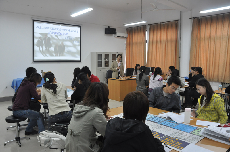 10月28日,beat365官网在8号楼一层沙盘实验室举办了第三届沙盘模拟大赛,09级30名研究生参加了本次比赛,工商管理系副主任吕鹏副教授担任本次比赛的指导教师。本次比赛设一、二、三等奖各一组。