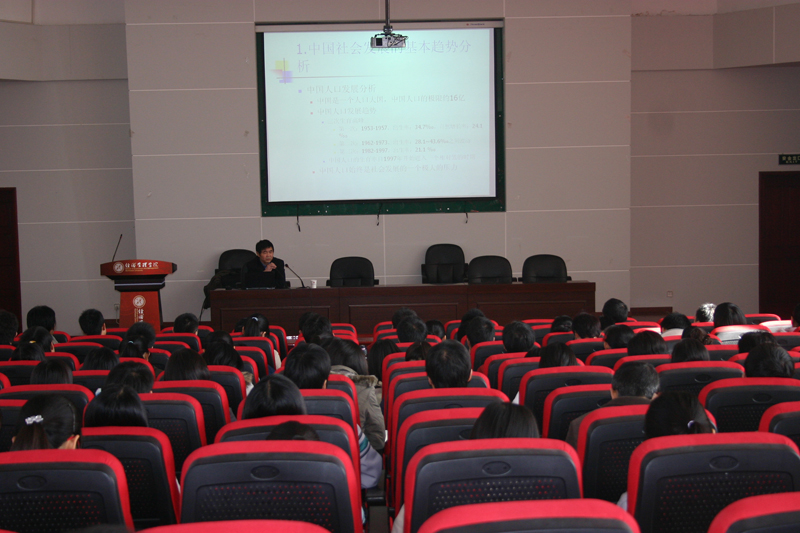 安教授首先从社会文化和经济两个角度分析了中国社会发展的趋势。当前中国社会处于转型时期,社会文化发展趋势是社会公平诉求、民主化程度将进一步提高,多元化的文化将进一步发展,家庭将进一步变小,人口流动性将进一步增大,公共产品需求量将进一步增大;社会经济的发展趋势是中国经济稳定增长的长期趋势不会有太大改变,中国劳动力过剩将维持一个相当长的时间,就业压力大将是中国社会面对的一个长期问题,中国城乡差别还将进一步扩大,但扩大的势头将有所下降,农村公共产品的提供速度加快农村消费水平将有较大幅度提高,较高水平的贫富差别依然长期存在。面对我国社会发展的实际情况,个人如何提高能力,做好生涯规划,选择适合自己的发展路径?安教授教导同学们要把个人选择和社会发展紧密地结合起来,指出个人是社会中的一元,是社会的一个细胞,个人发展与社会发展密切相关,个人选择要充分认识社会经济发展的趋势,要顺应社会需求,正所谓“世事造英雄”,而“英雄造世事”则是个人对社会发展的贡献。在个人的发展过程中要注重智商发展与情商培养,使二者均衡;在人的一生中要注重理论水平和实践经验的双重提升,理论与实践是人生之车之两轮,只有平衡发展,才能达到更远目标。