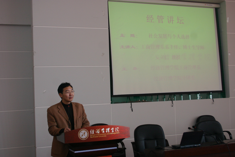 2008年11月19日,工商管理系主任、博士生导师安立仁教授应邀在金海报告厅为学生作了题为“社会发展与个人选择”专题报告会。报告会由学院党总支副书记樊涛老师主持。行政副院长严汉平教授出席了报告会。学院各类学生共200多人参加了报告会。