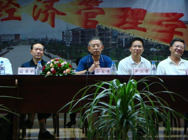 今年我们招收本科生302人,各类研究生585人,其中博士生46人,硕士生157人, MBA 382人,共计各类学生887人。我们实现了由本科教育为主向研究生教育为主的转化。一是学院具有一流的教学设施,包括先进的计算机房、电子阅览室、图书资料室,学院图书室有各类图书近3万册,杂志200余种,报刊40余种;二是具有一流的教师队伍,有教授29名、副教授40名,教师具有博士学位或正在攻读博士学位的70多名。三是具有一流的管理机构与水平。因此,我相信:通过我们师生共同努力,在你们在座的同学中间,会出现更多的经济学家、管理学家以及企业家、优秀党政管理人员!