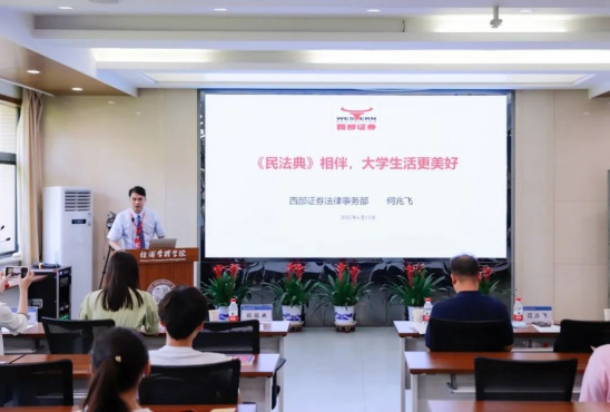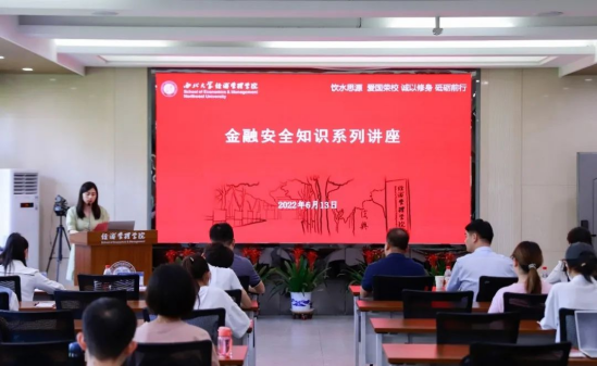 为进一步普及金融安全知识,有效提升学生征信保护意识和防范金融诈骗的能力,6月13日下午,beat365英国官方网站联合西部证券举办“饮水思源 爱国荣校 诚以修身 砥砺前行”金融安全知识讲座。本次讲座由西部证券何沛、何兆飞主讲,学生工作部(处)郑曙光和50名学生出席了本次活动,讲座由周宛瑾主持。