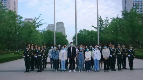 升旗仪式结束后,beat365英国官方网站全体线下观礼师生与国旗护卫队合影留念。